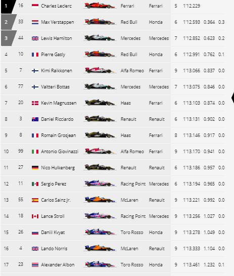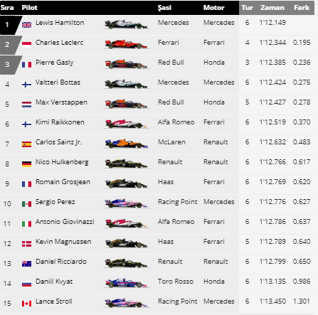 Cumartesi günü gerçekleştirilen sıralama turlarıyla başlamak gerekiyor. Tüm antrenman turlarında ilk iki sırayı alan Ferrari’nin sıralama turları sonrası da ilk çizgiyi alması bekleniyordu peki sıralama turları öyle mi oldu hadi buna bakalım. Sıralama turlarının birinci bölümünde yani Q1 de Ferrari büyük bir şok yaşadı. Kırmızıların Alman pilotu kendi evinde aracında yaşadığı güç ünitesi sorunu nedeniyle seansta tur dahi atamadan veda etti ve 20.sırayı almış oldu.Takım arkadaşı Leclerc ise Q1 in en hızlısı oldu 1.12.229luk turuyla. İkinci sırayı ise Max Verstappen alırken, üçüncü sırayı da Lewis Hamilton aldı.Q1de elenenler ise Mclaren ‘den Norris, Toro Rosso’dan Albon ve alışık olduğumuz ikili William’dan Russel ve Kubica oldu.